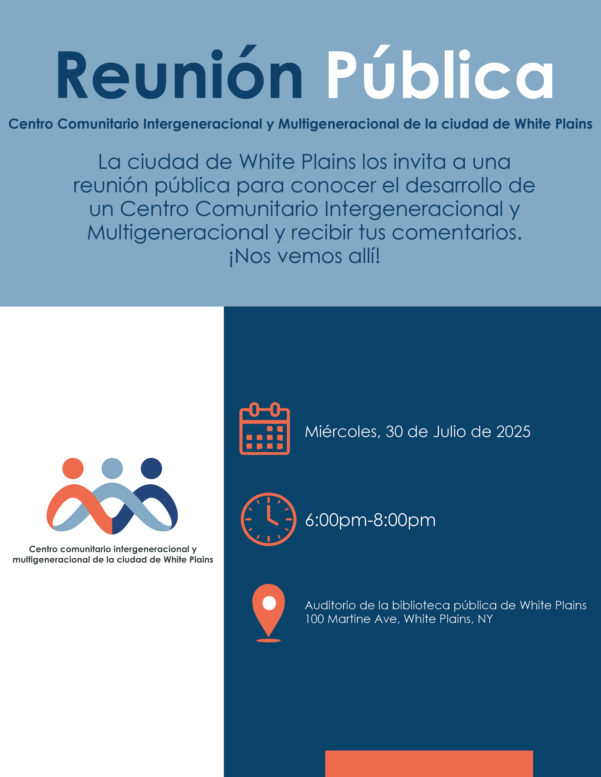 The City of White Plains is conducting a feasibility study and implementation plan for a brand new Inter/Multi-Generational Community Center! The Center is proposed to be a centralized, year-round indoor facility that will serve residents of all ages. This facility will provide flexible, accessible space for recreation, education, and community programming.